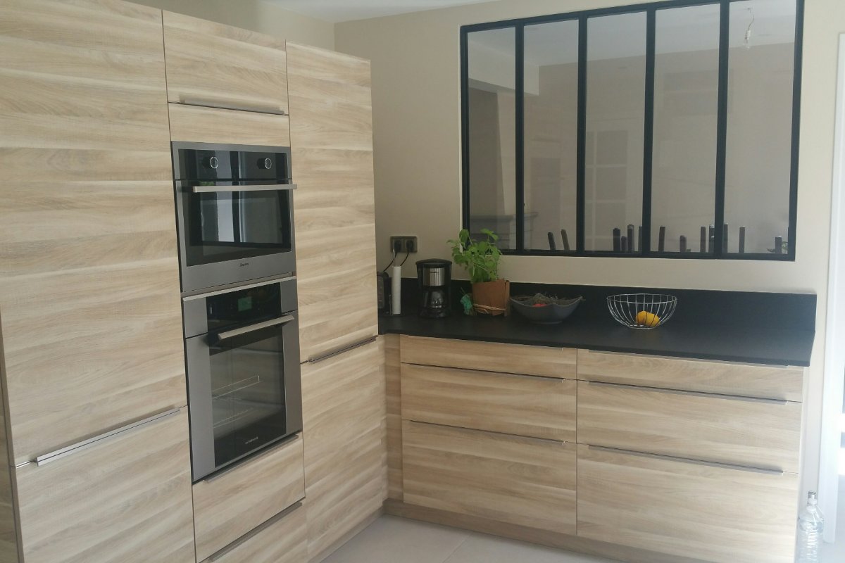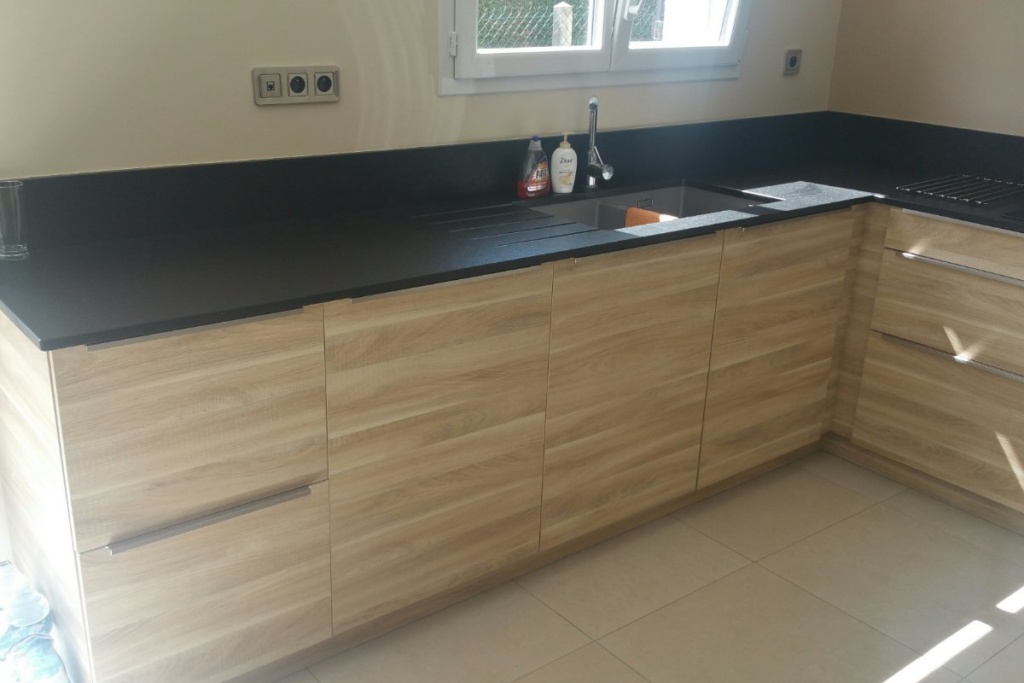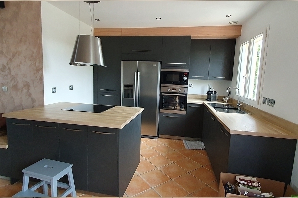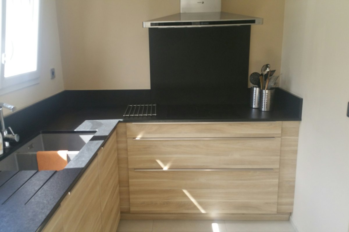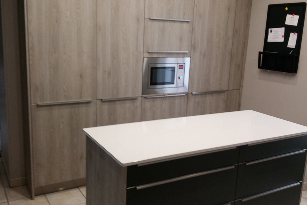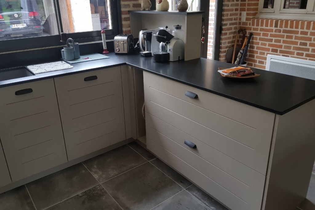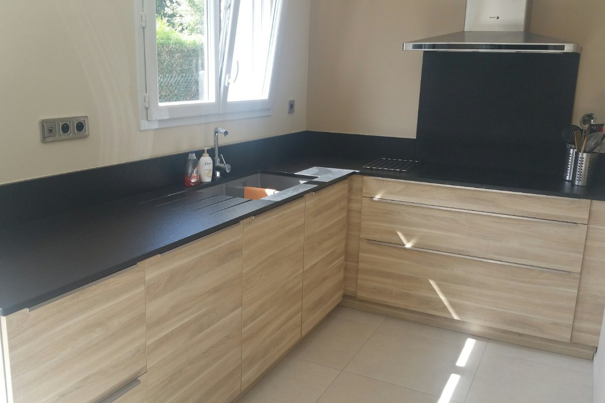 Cuisine Façade Chêne cendré et Noir brossé, plans de travail stratifié.