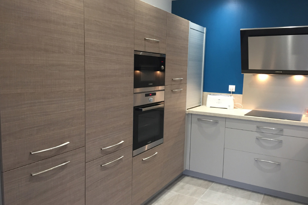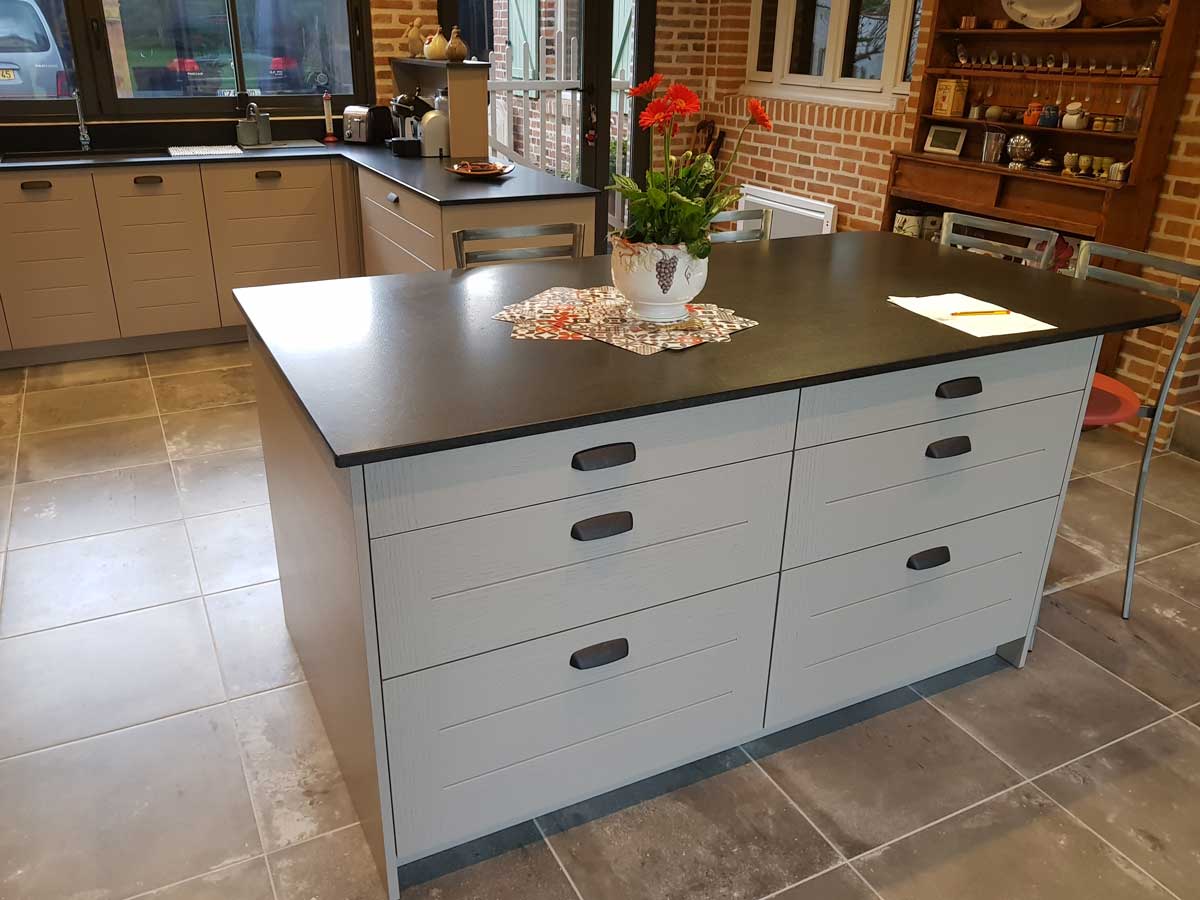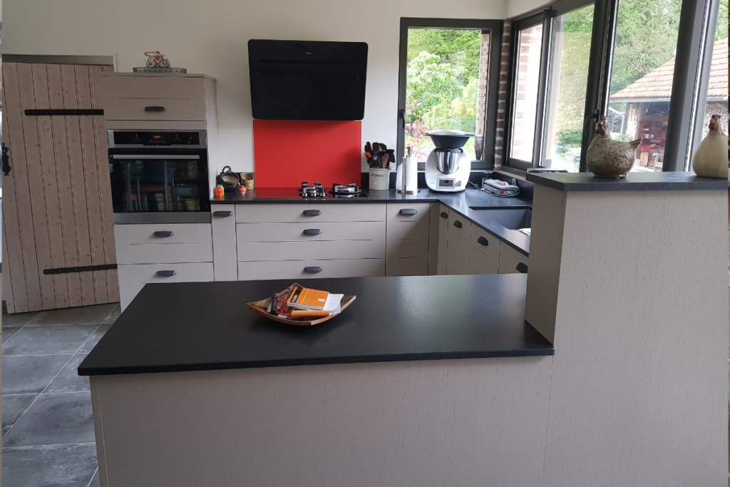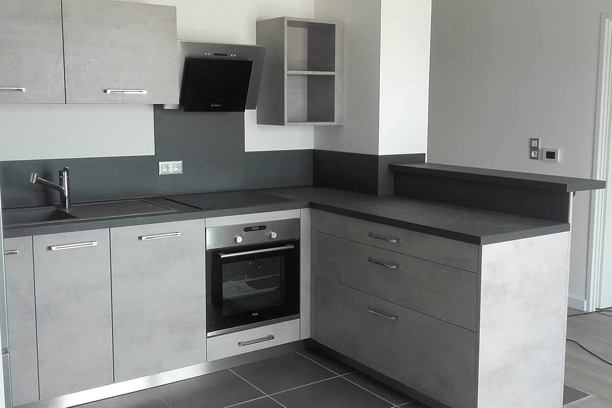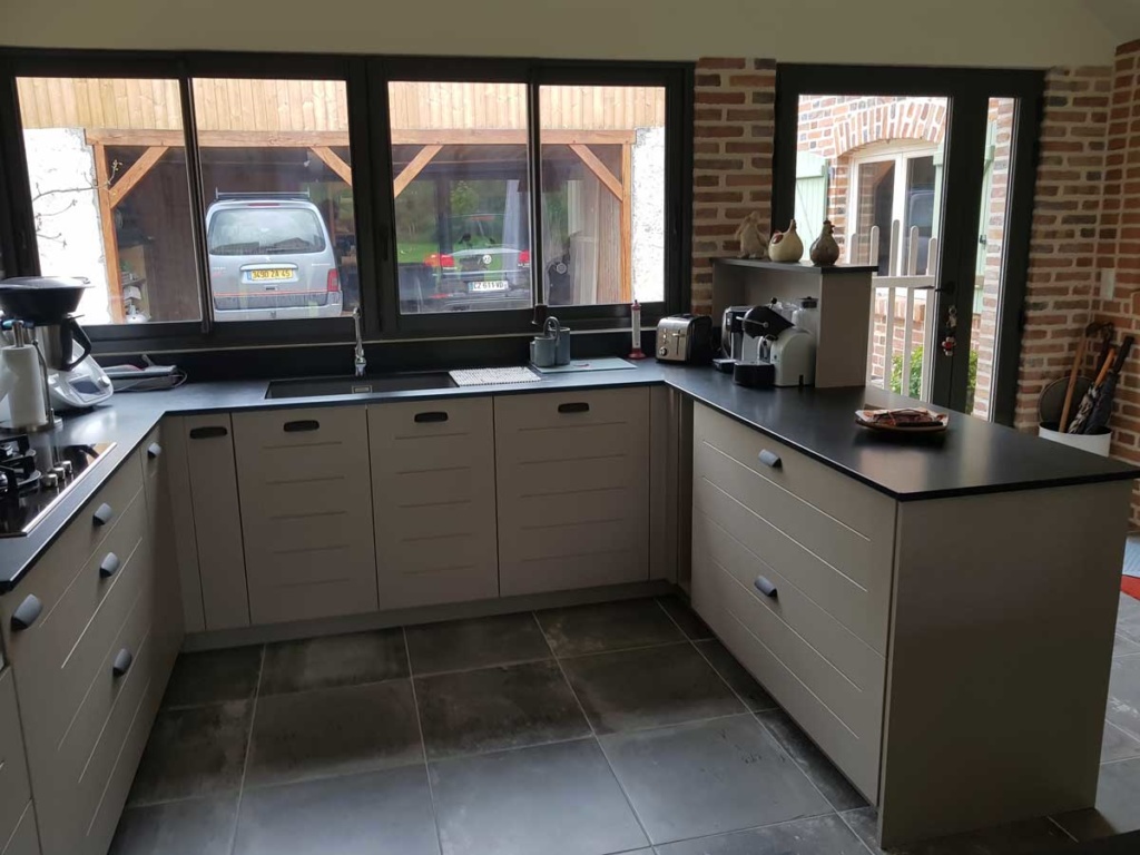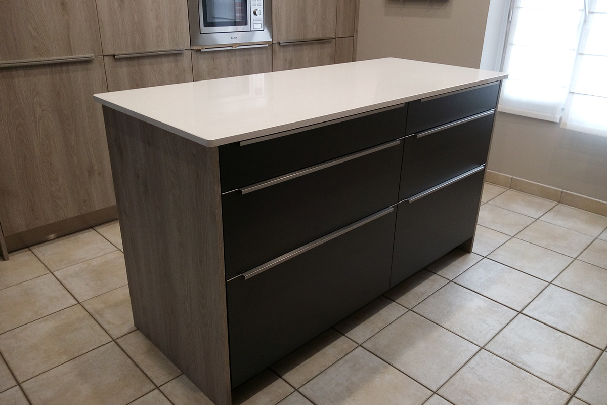 Cuisine Façade Chêne cendré et Noir brossé, plans de travail stratifié.