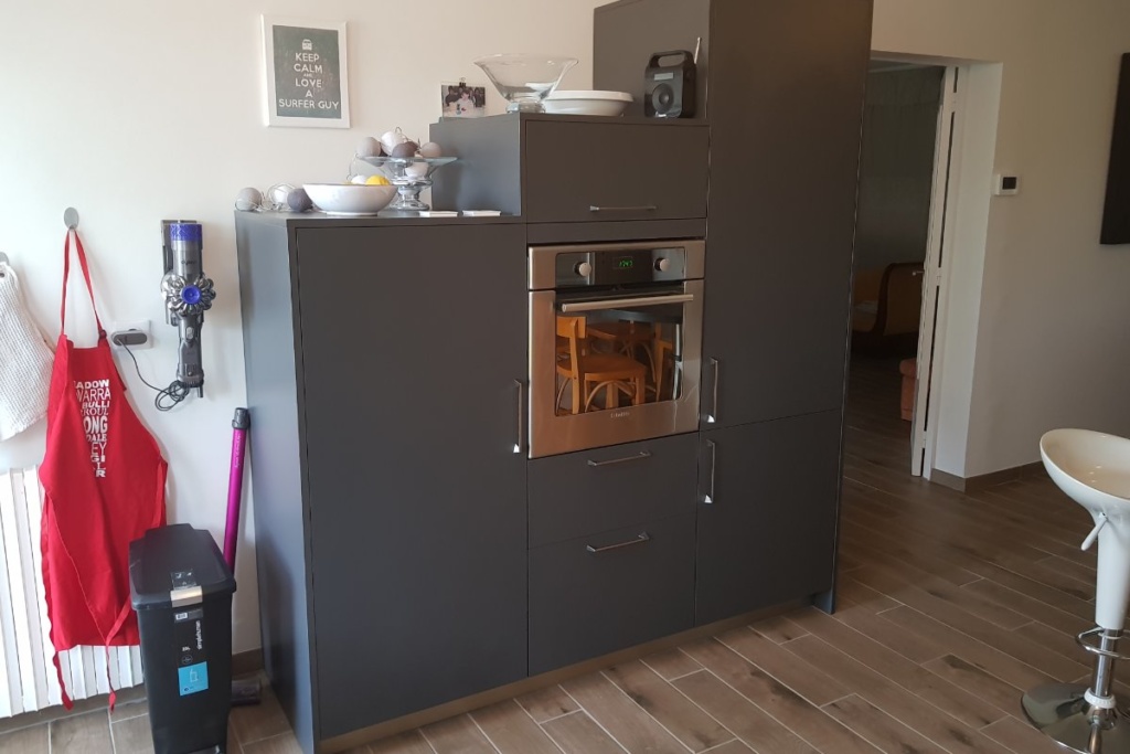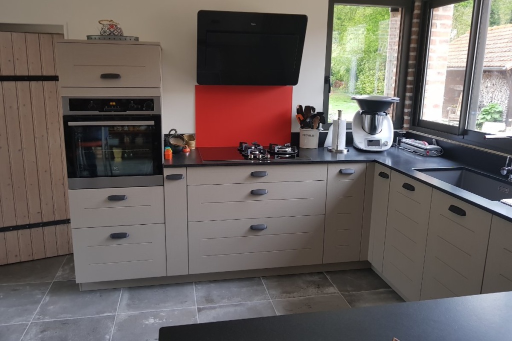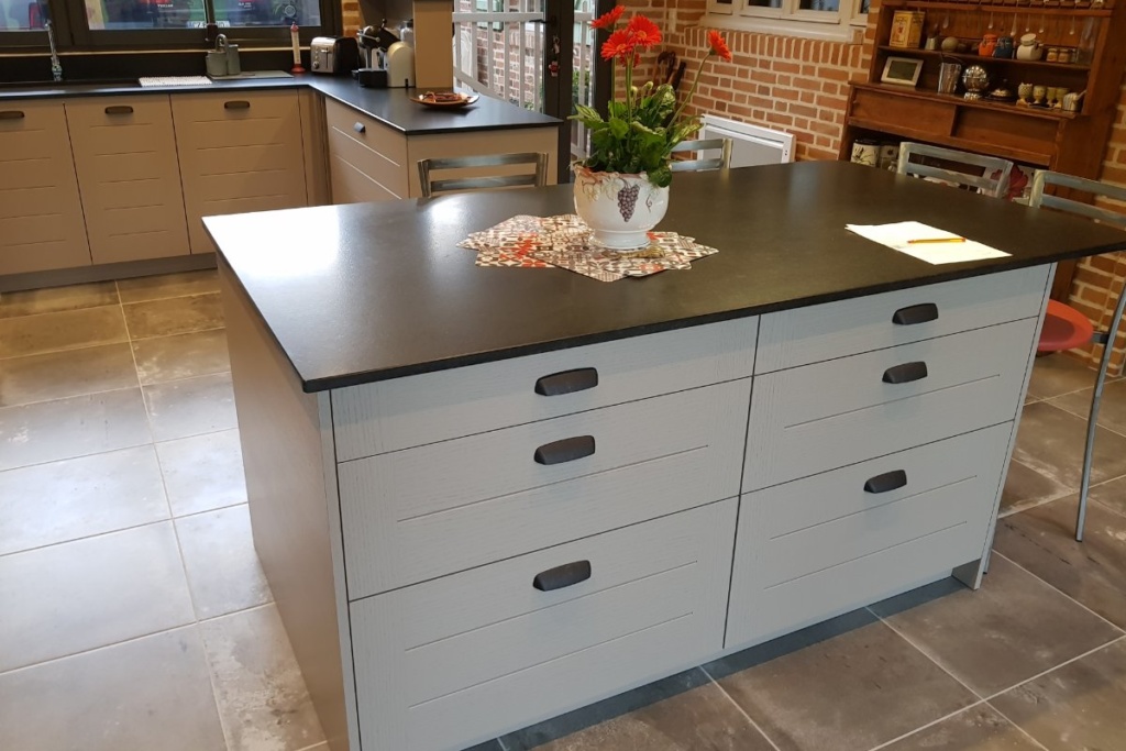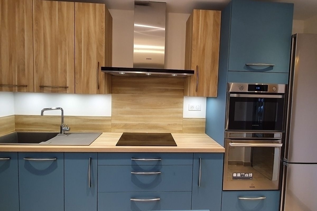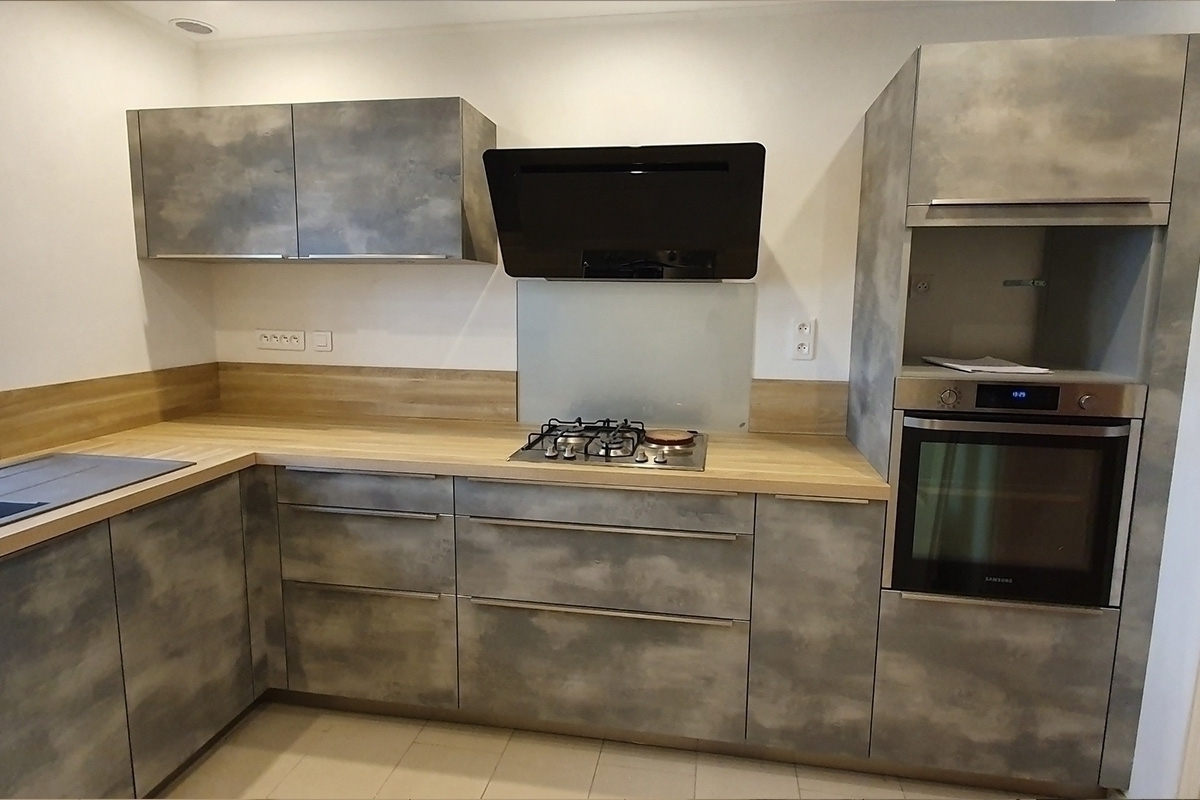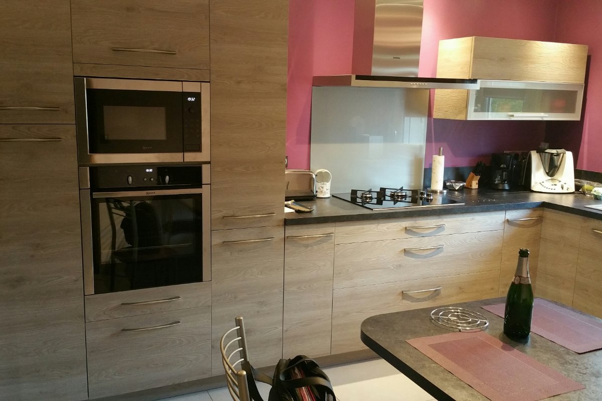Cuisine Façade Chêne cendré et Noir brossé, plans de travail stratifié.