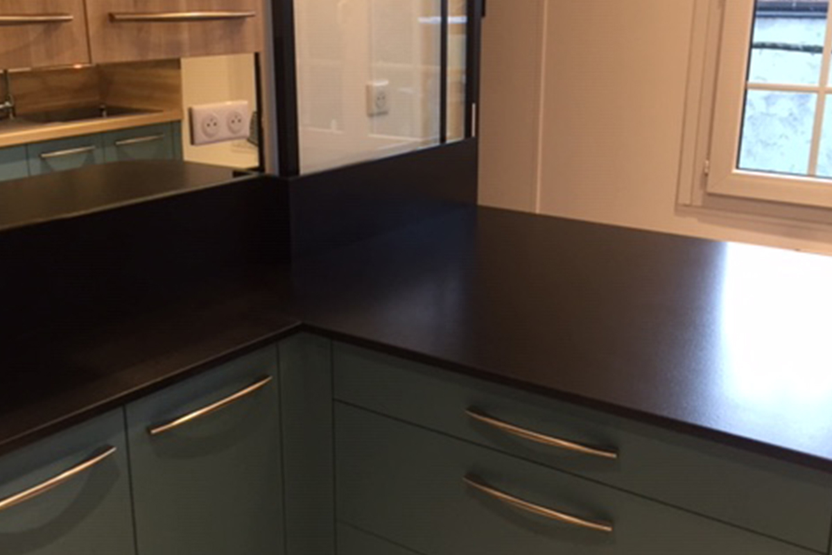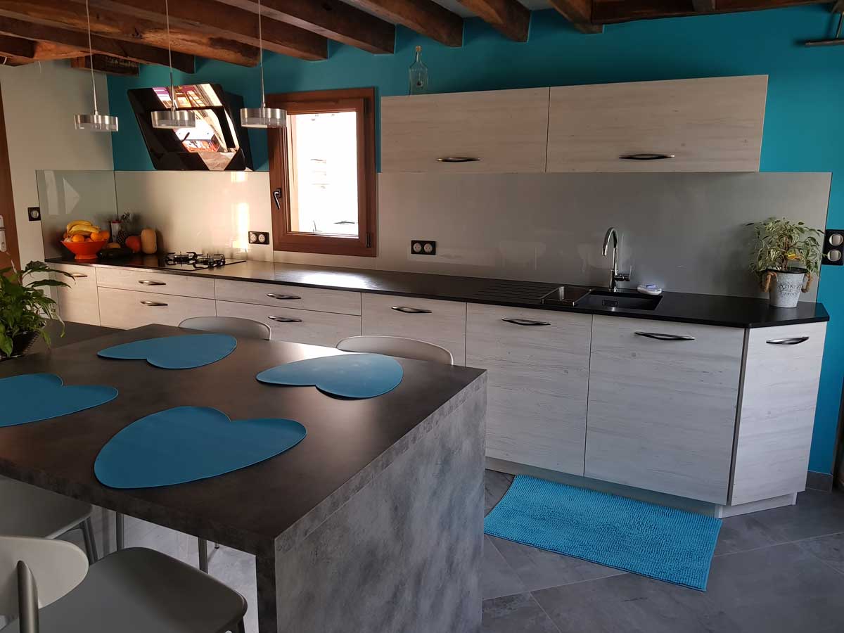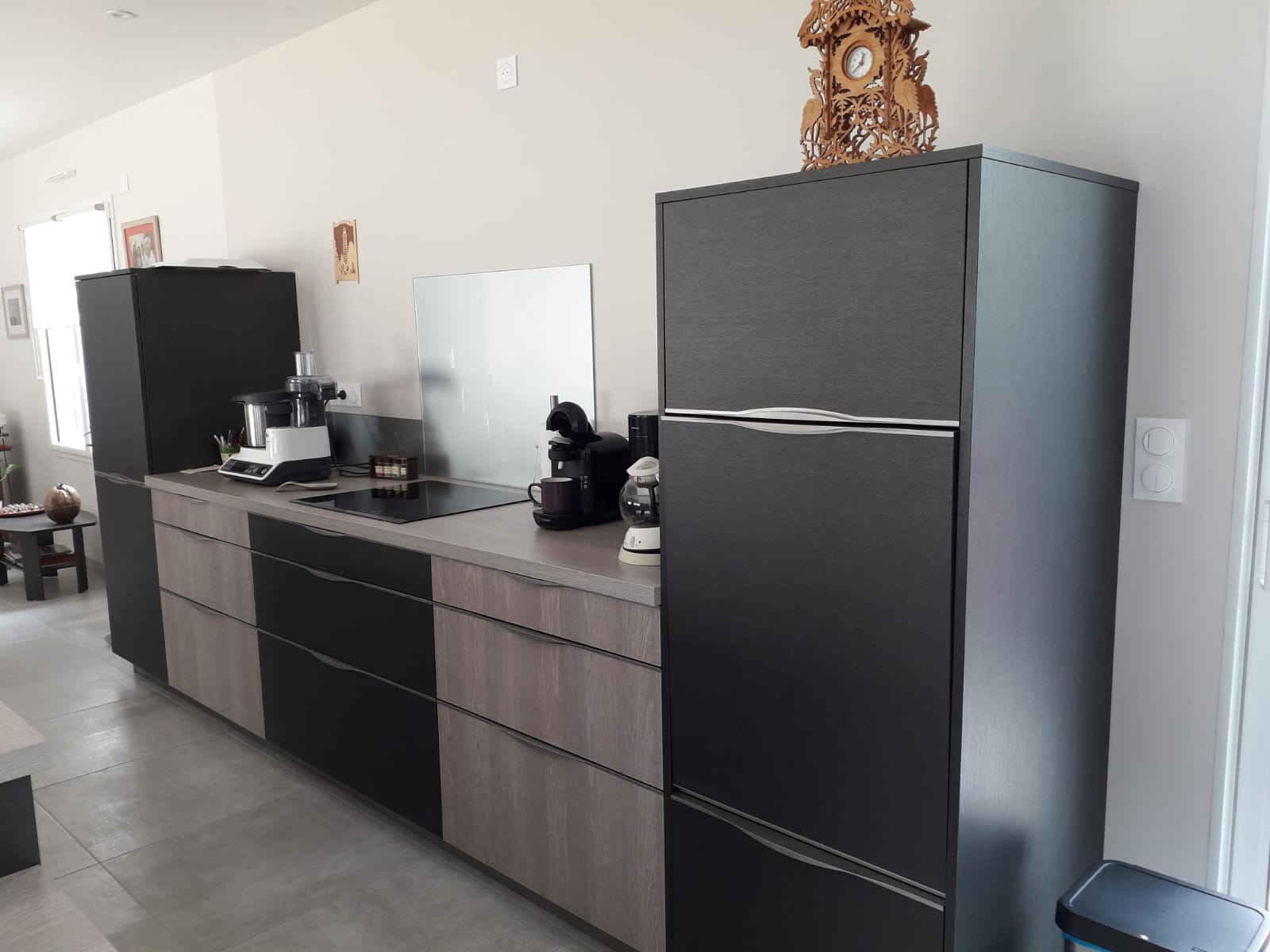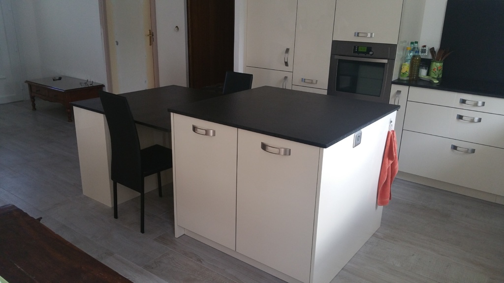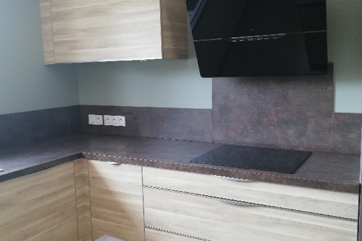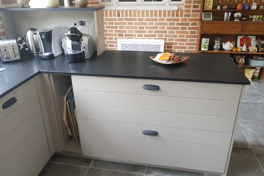 Cuisine Façade Chêne cendré et Noir brossé, plans de travail stratifié.