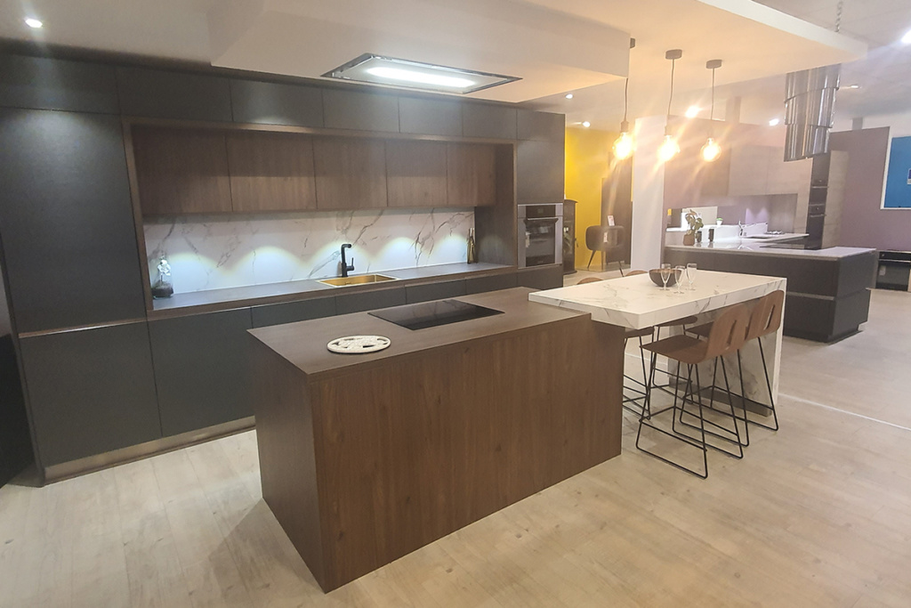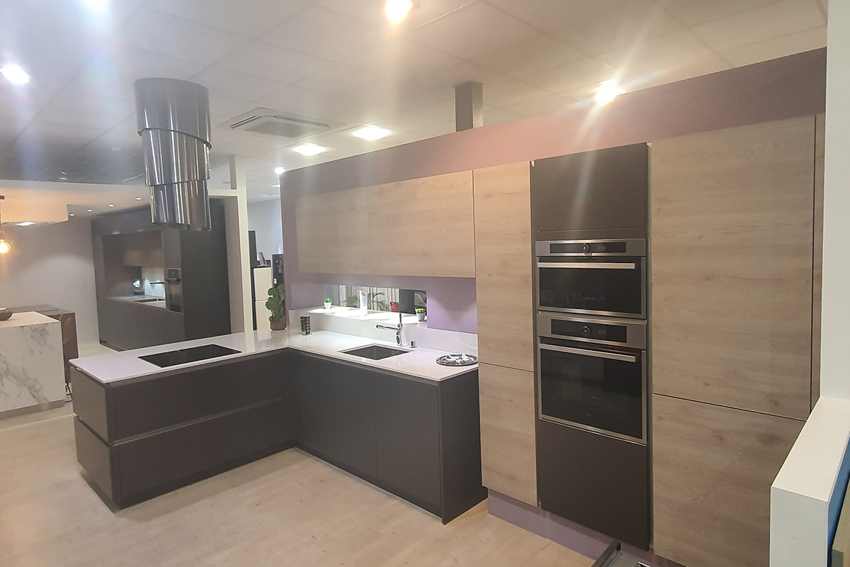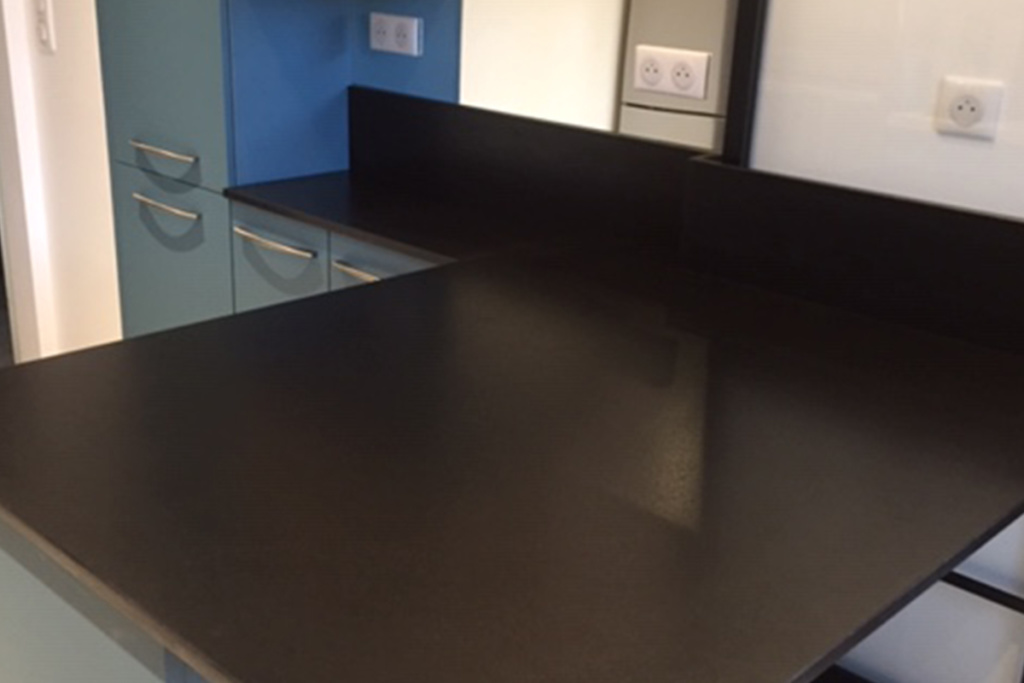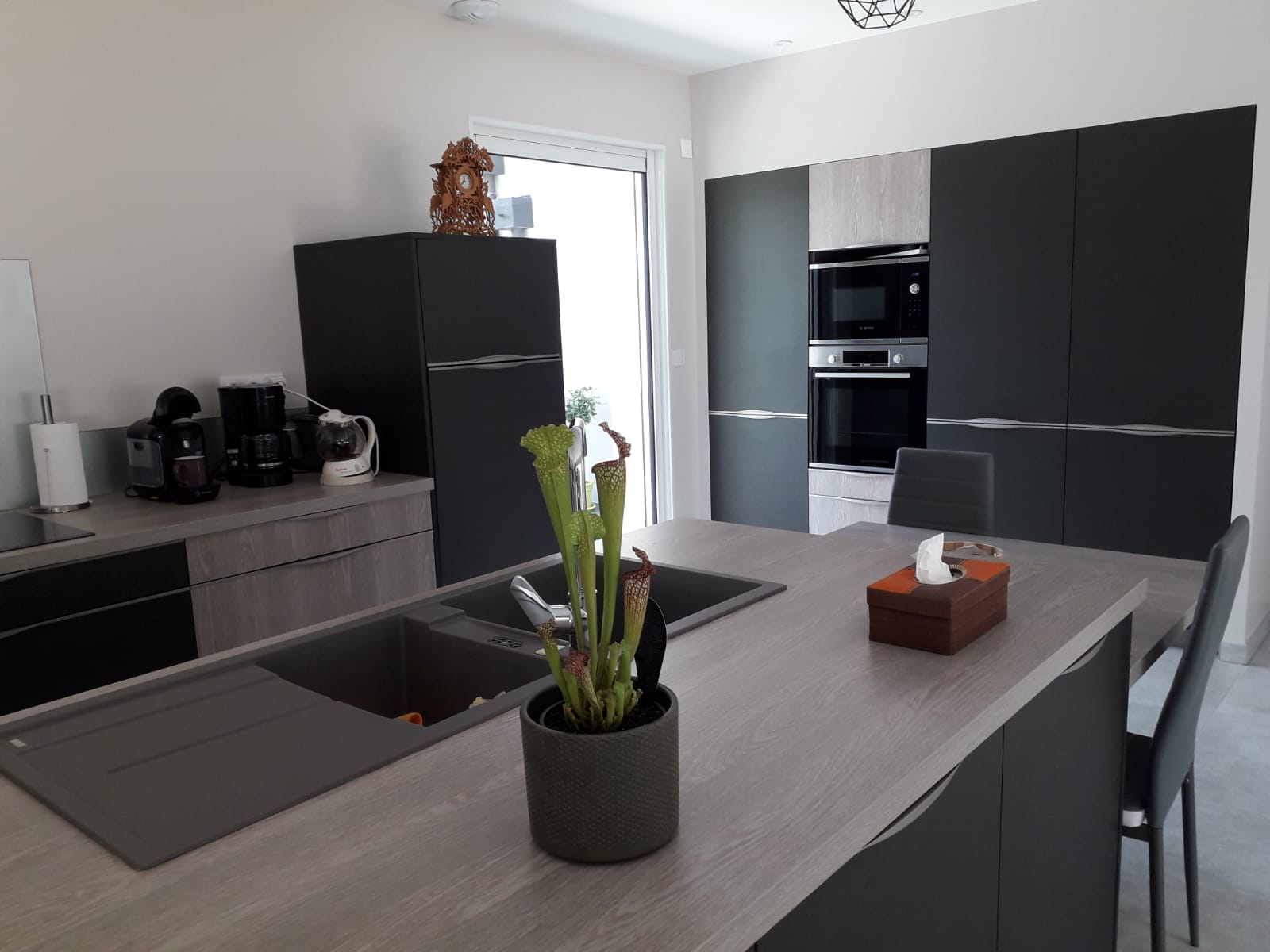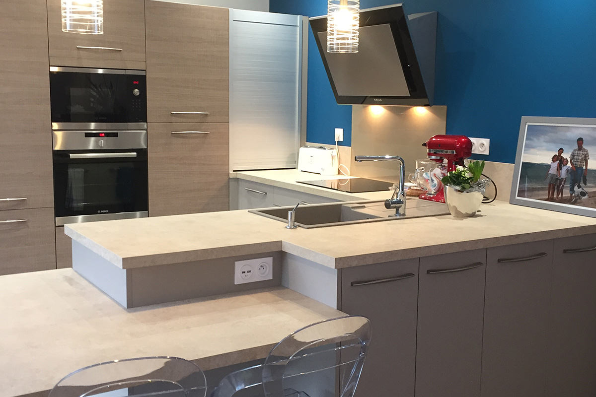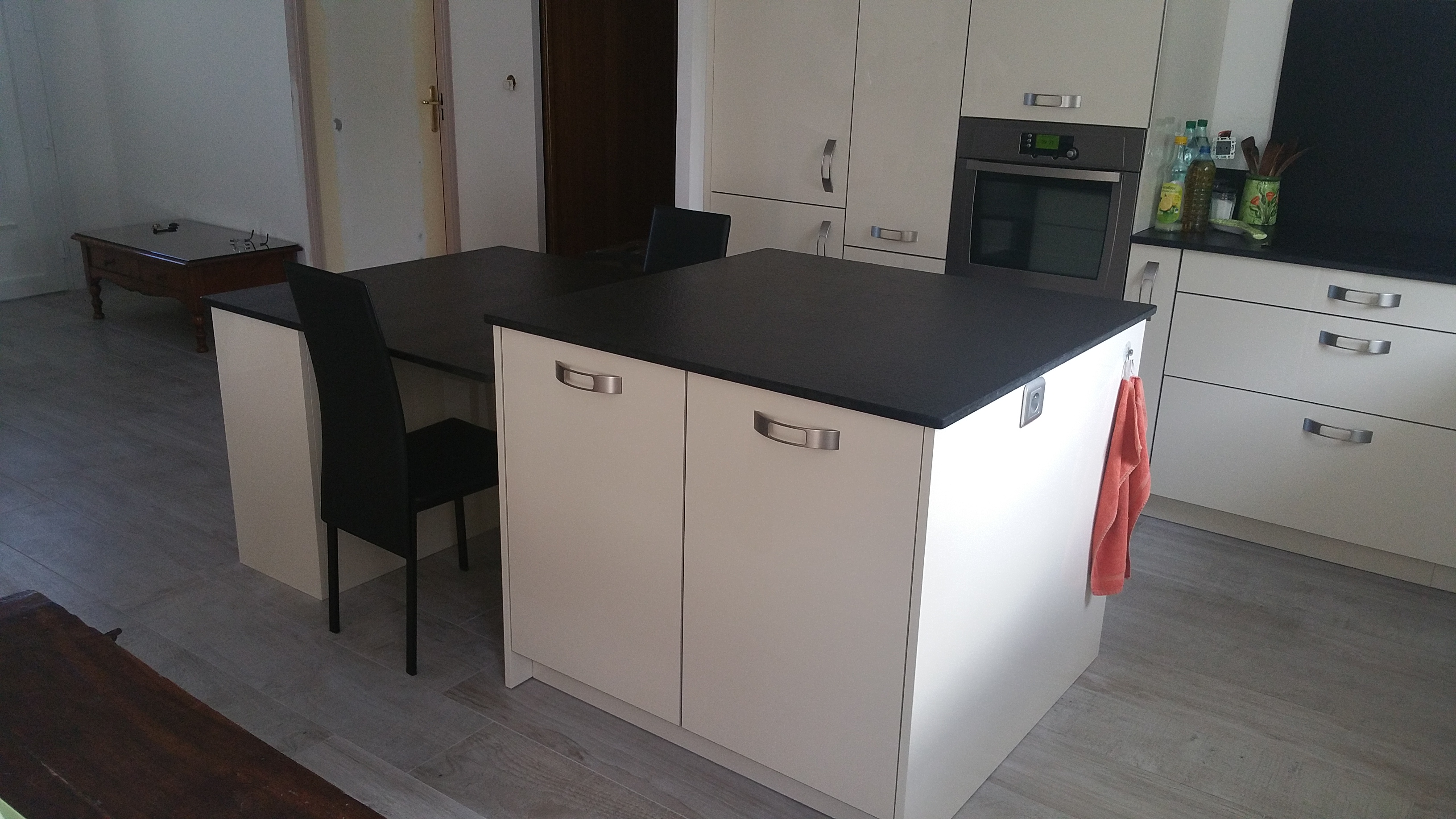Cuisine Façade Chêne cendré et Noir brossé, plans de travail stratifié.