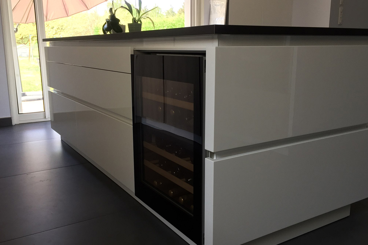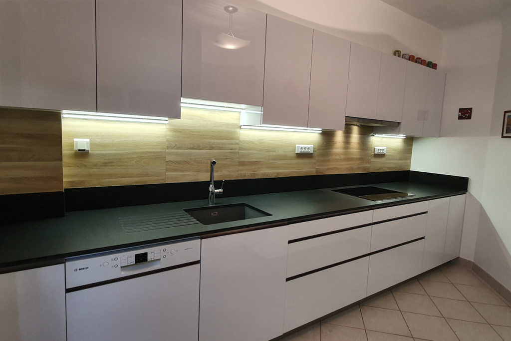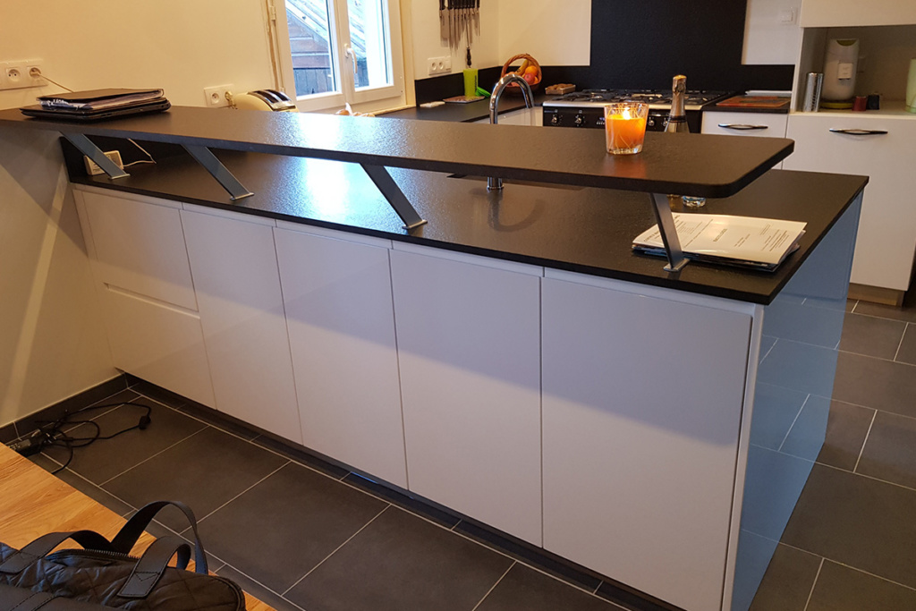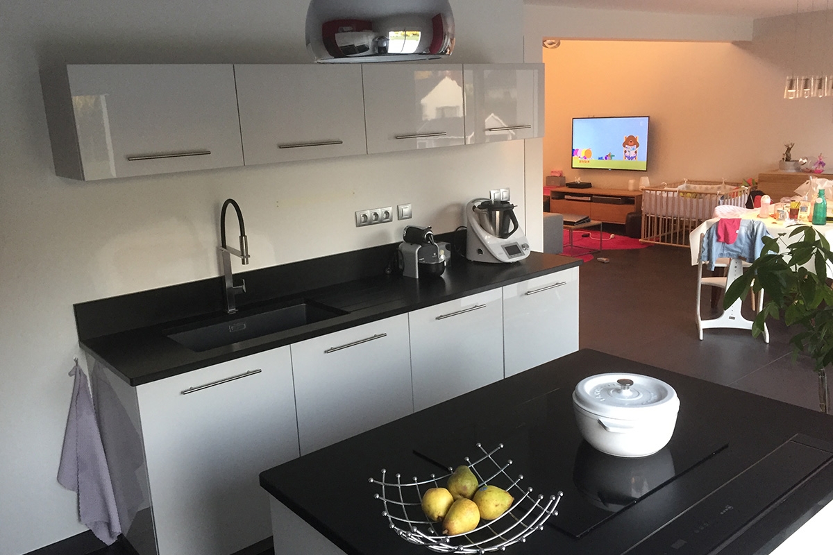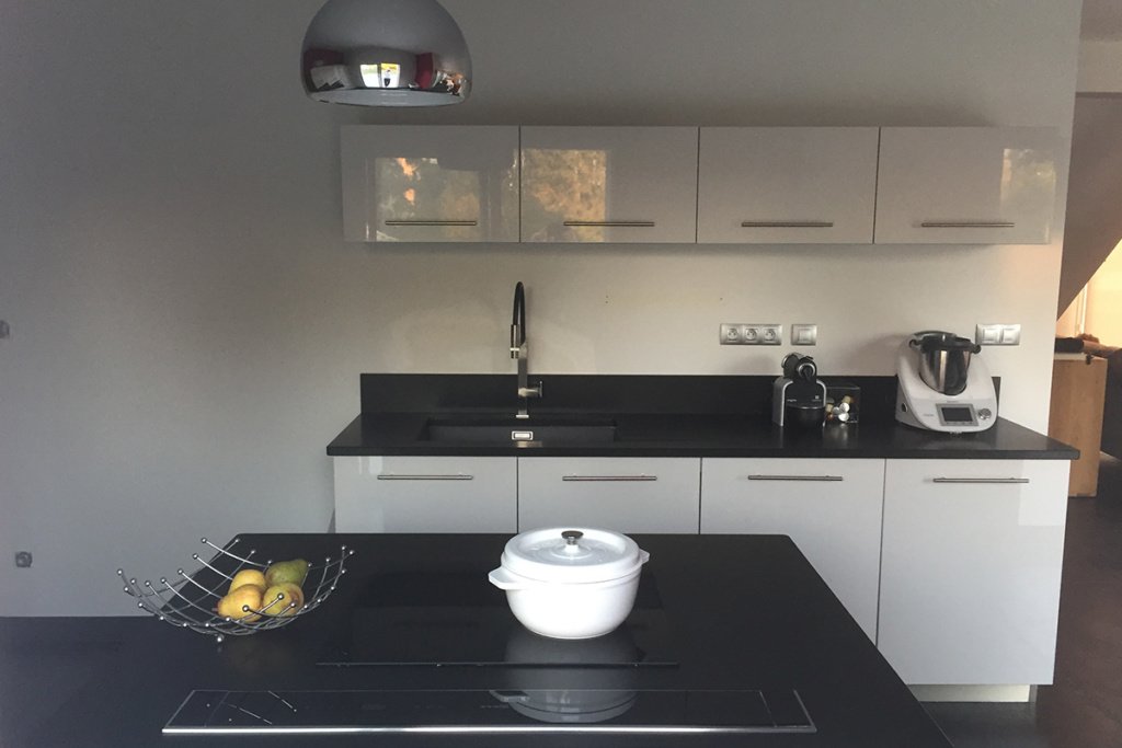 Cuisine Façades avec profil inox brossé, soft Blanc Brillant et plans de travail Granit Noir Blacki Letano