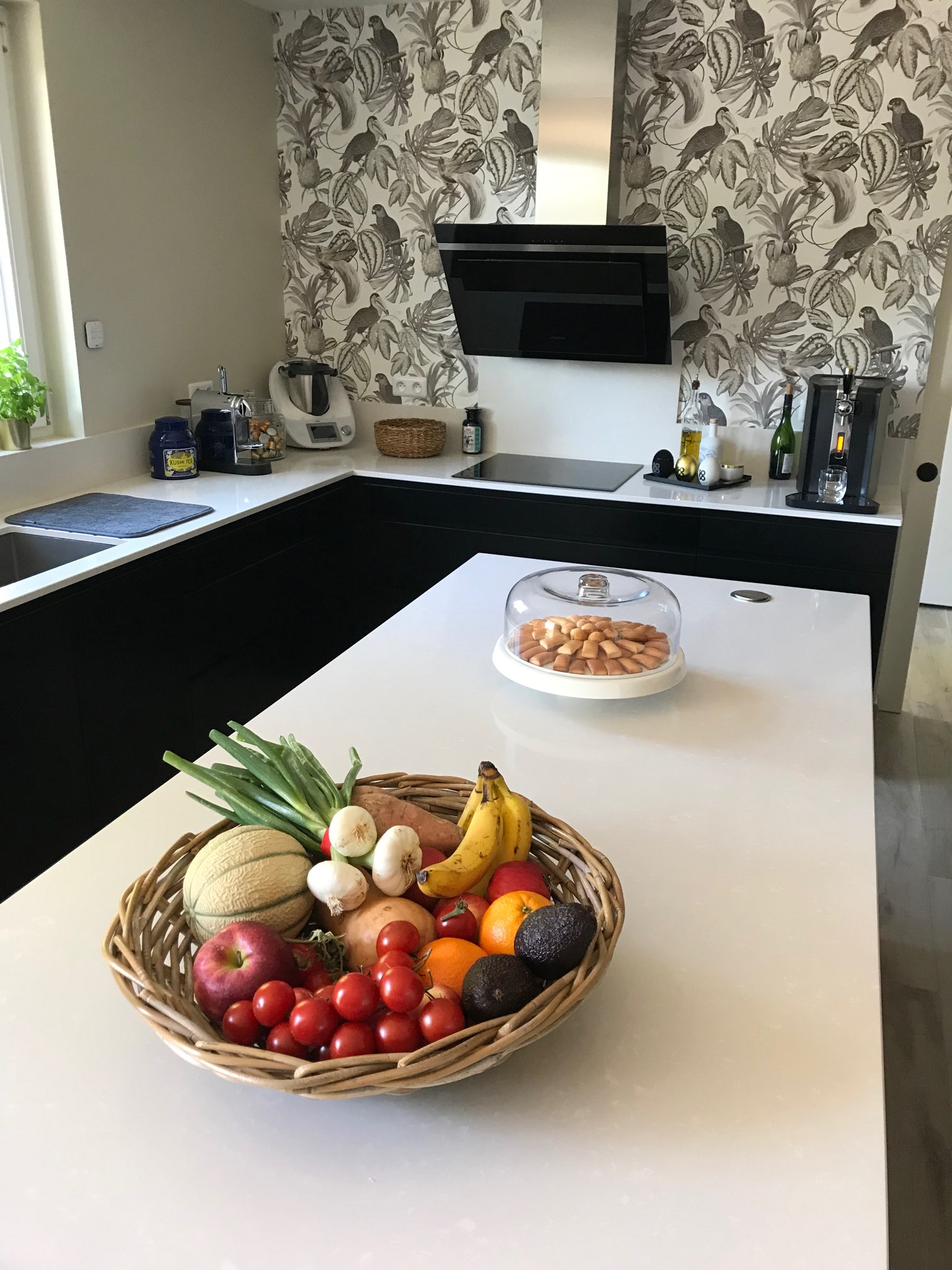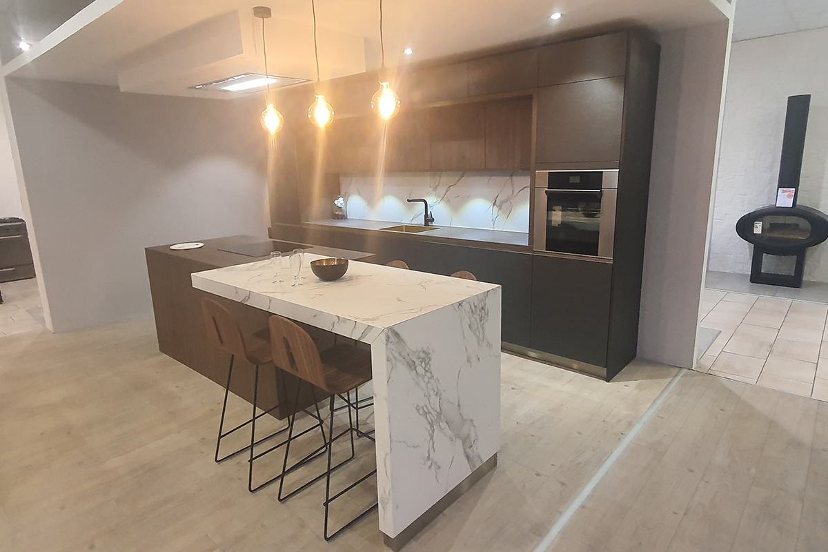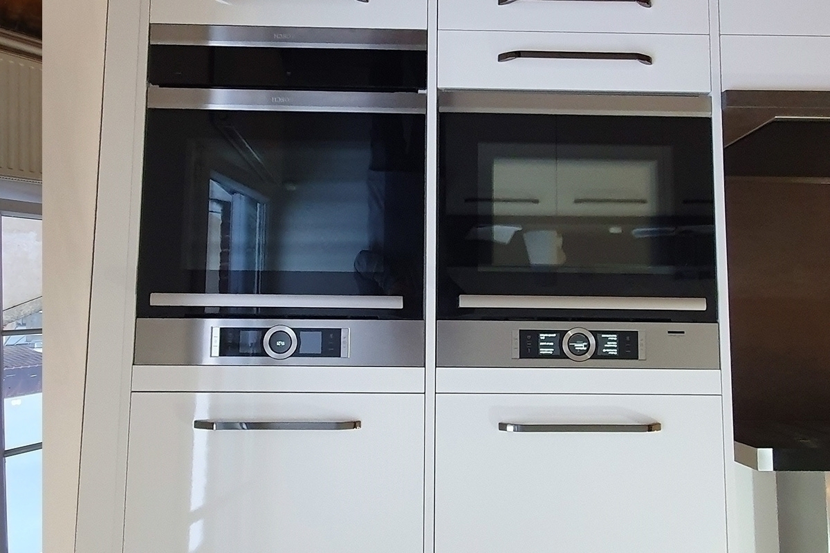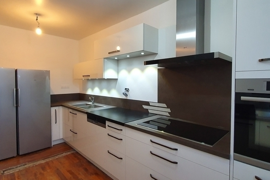 Cuisine Façades avec profil inox brossé, soft Blanc Brillant et plans de travail Granit Noir Blacki Letano